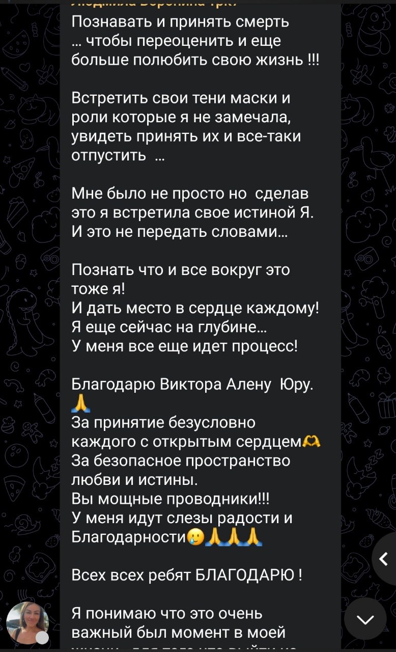 Второй процесс чистый и красивый…был про отпускание всех обид, страхов, про правила энергетической безопасности в реальности, про подсказки, дары, предназначение, про женское и мужское, про взаимодействие в этом красивом…Я вошла в него с запросом про любовь и благоДарность…потому что эти состояния окрыляют. Когда меня вырвало… пришло осознание что выходит из меня…с благоДарностью приняв и это, я пошла дальше в своём путешествии. В процессе всё было настолько идеально, в те моменты, когда меня накрывало прошлое или страхи будущего, а может прошлого, там как будто не существует времени или просто тело становилось слабым и не слушалось, всегда приходила поддержка ведущих и участников за что огромная благоДарность.